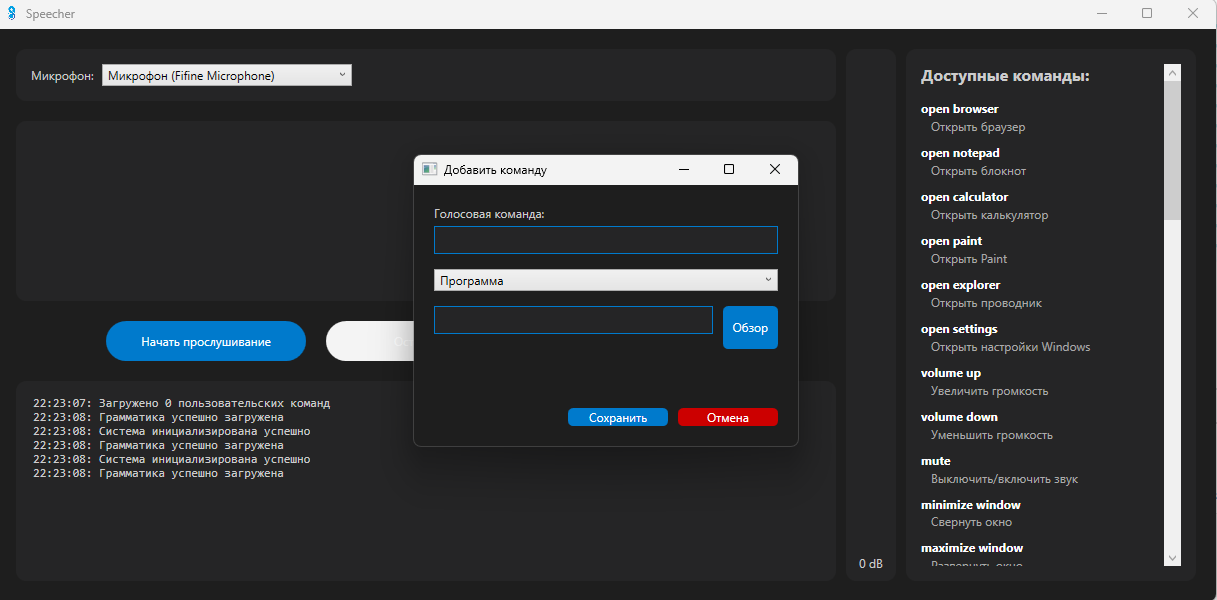 Пользовательские команды: возможность добавления собственных команд для запуска программ, открытия ссылок или ввода текста, что делает Speecher адаптируемым под индивидуальные нужды.